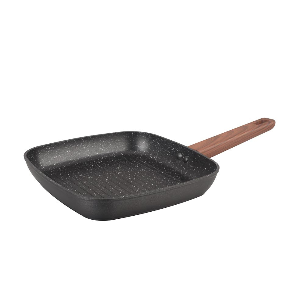 Grill cuadrado de 24x4cm: aluminio, interior marmolado bicapa, antiadherente con asa y mango efecto madera soft touch.